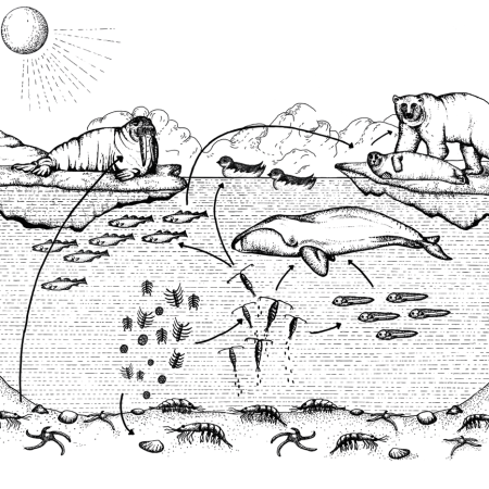 When spring and summer come, the light from the sun causes the production of phytoplankton to increase. The ice algae which have been caught in the ice all winter, start to bloom.
