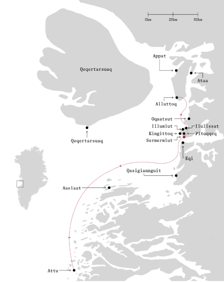 På kortet side 19 i bogen kan du se, hvor inuit fra Sermermiut rejste hen.