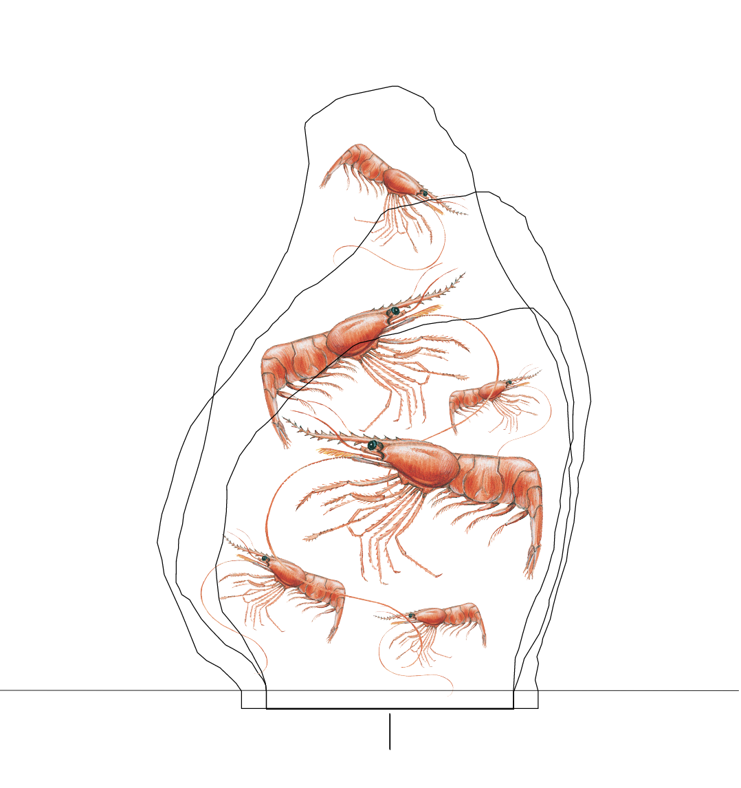 Krill lever af det planteplankton der findes under havisen, men den sørger også for føde til dyrene på bunden, fordi dens afføring synker ned på bunden.