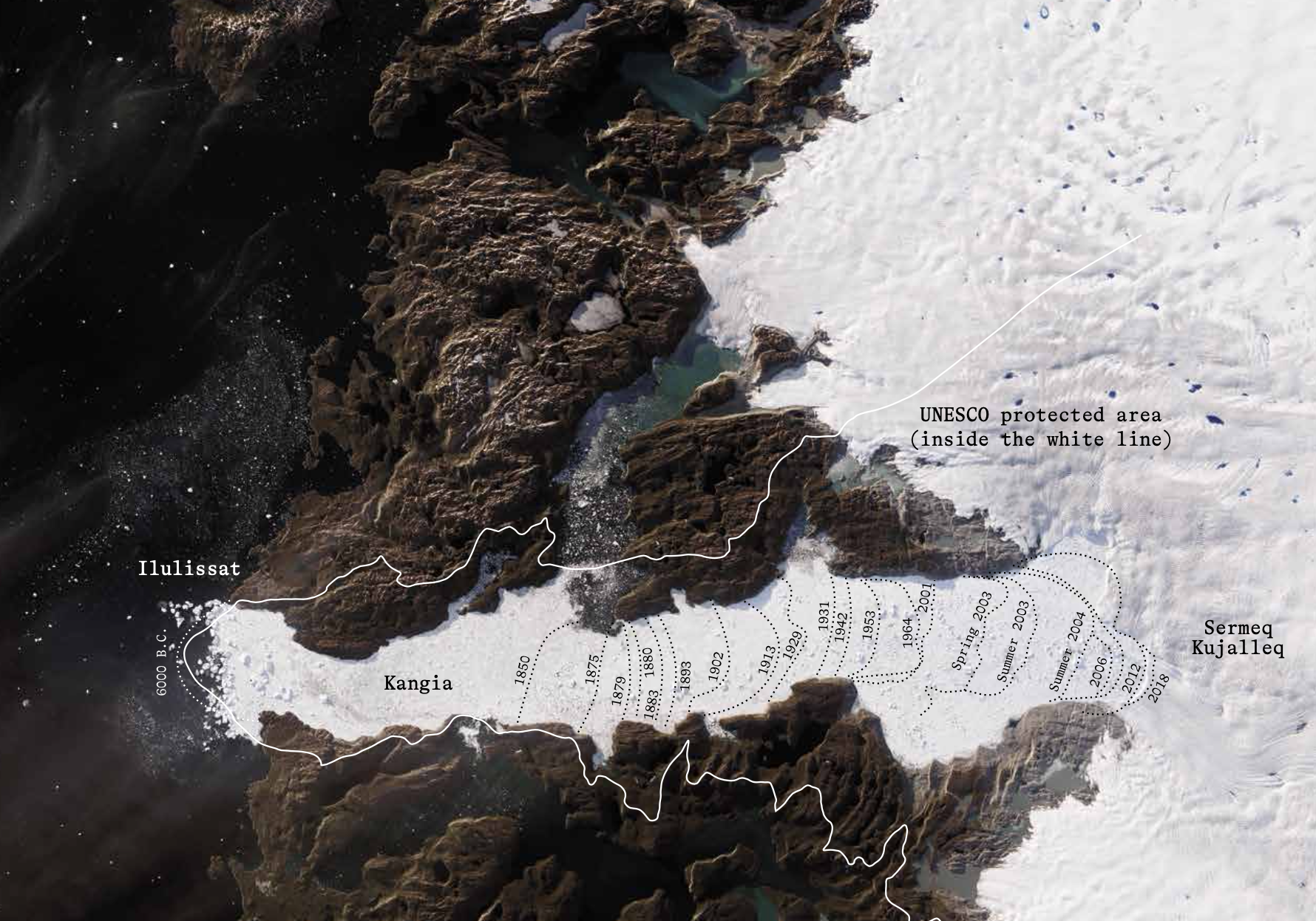 I 6000 f.v.t lå gletsjer-fronten ved Isfjordens udmunding. 7.875 år senere, lå den ca. midt i.