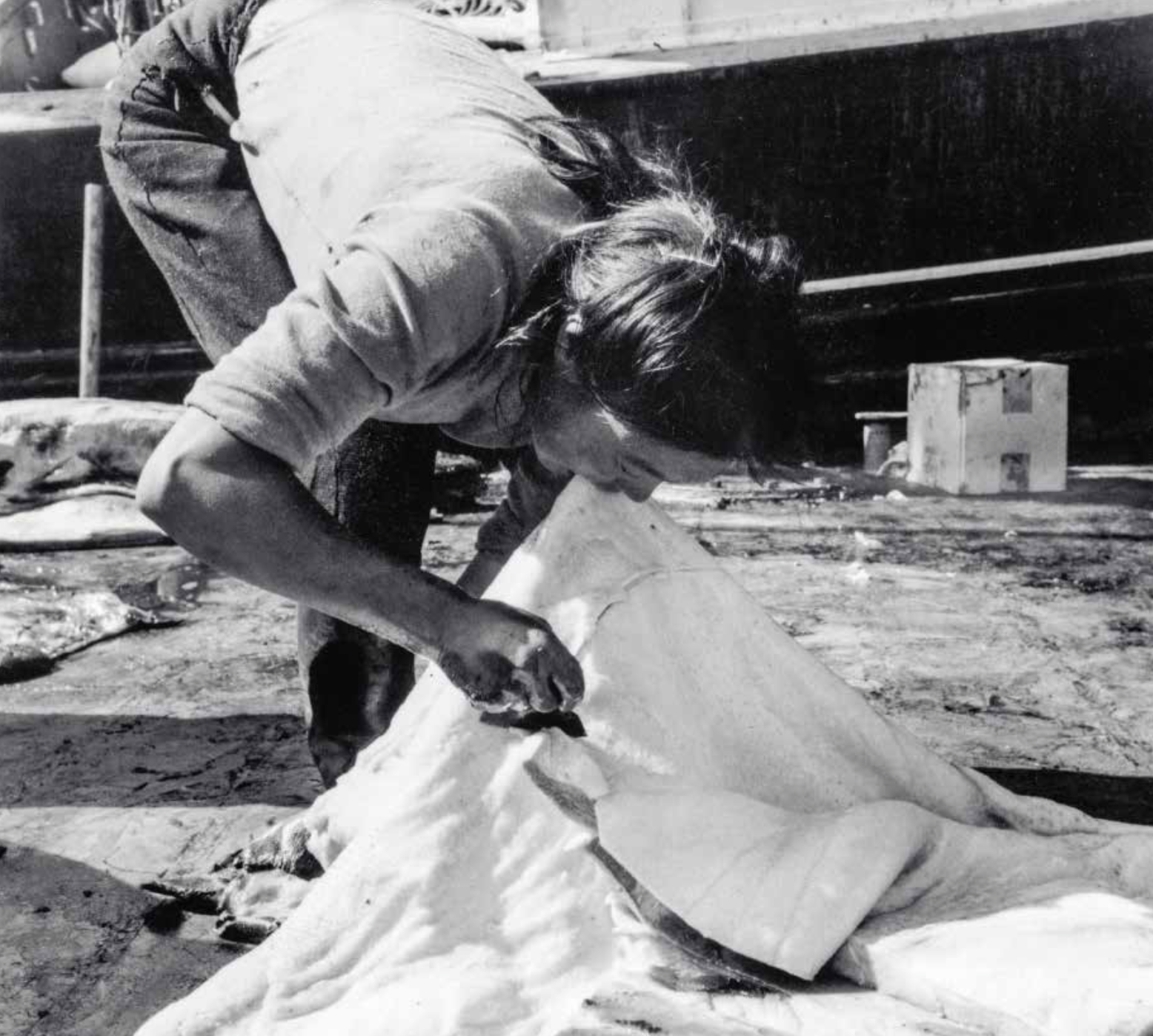 Når et havpattedyr var nedlagt og bugseret på land, blev det skåret op og skindet blev flænset. Det var mændene, der harpunerede havpattedyrerne og som regel kvinderne, der rensede skindene.
