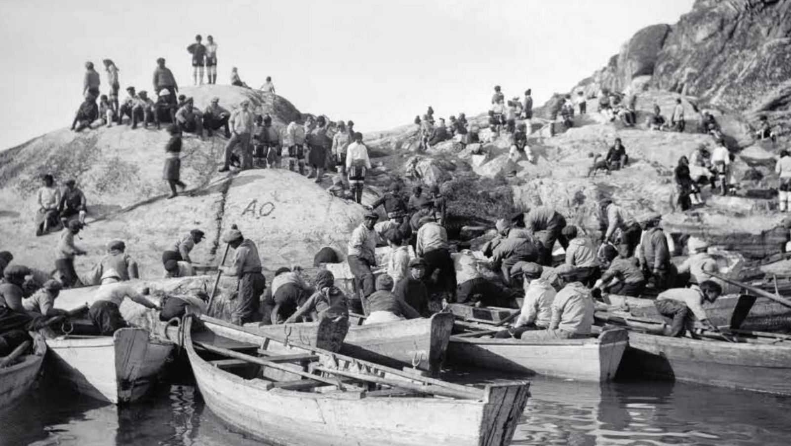 Dette billede af joller er fra Ilulissat i 1933. I bogen er et billede fra 2017. Der benyttes stadig joller til fiskeriet, de er bare med motor.