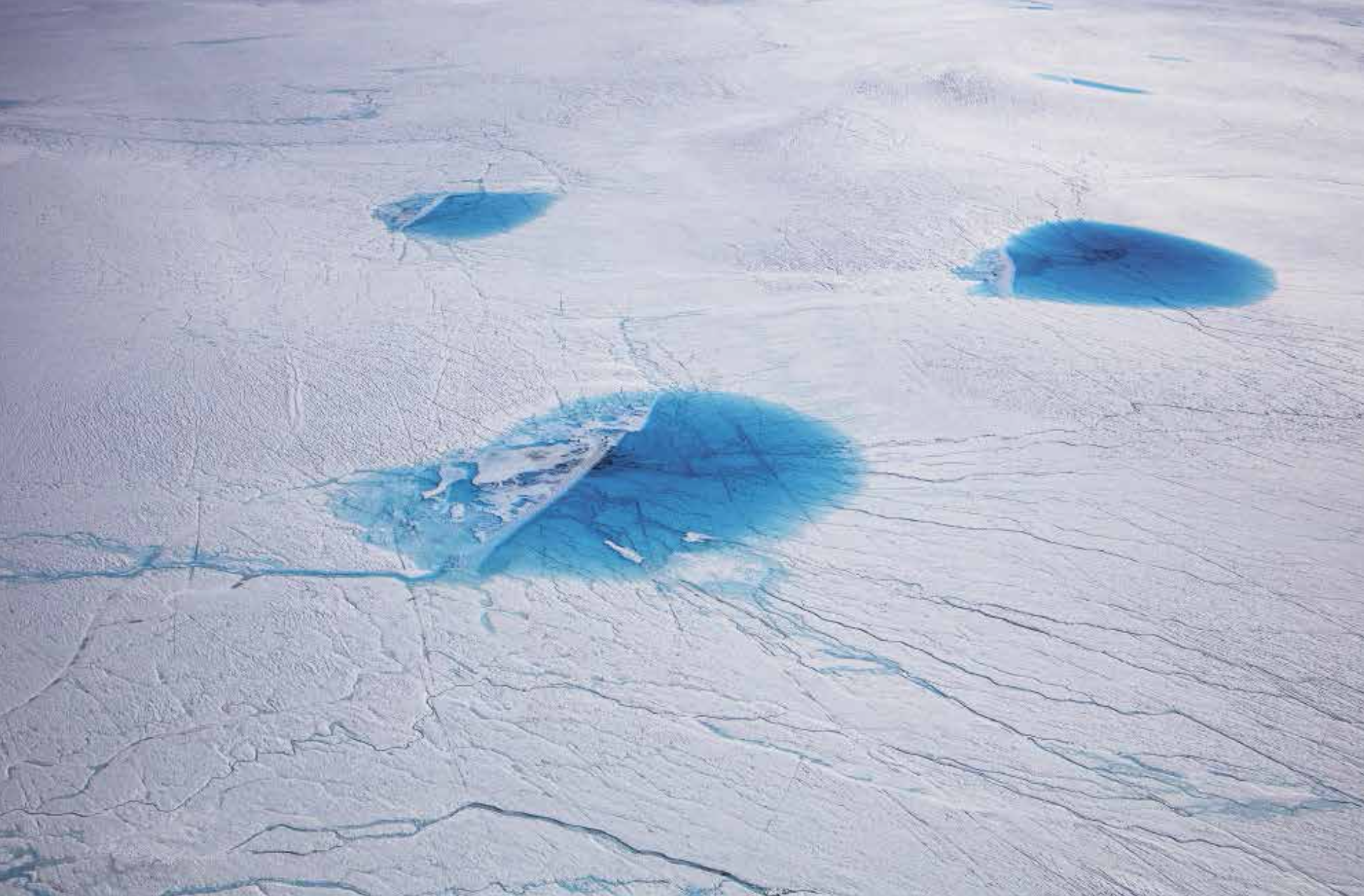 Solen varmer indlandsisens overflade op og skaber turkisblå floder på toppen. Nogle af floderne ender i brønde i bunden af isen.