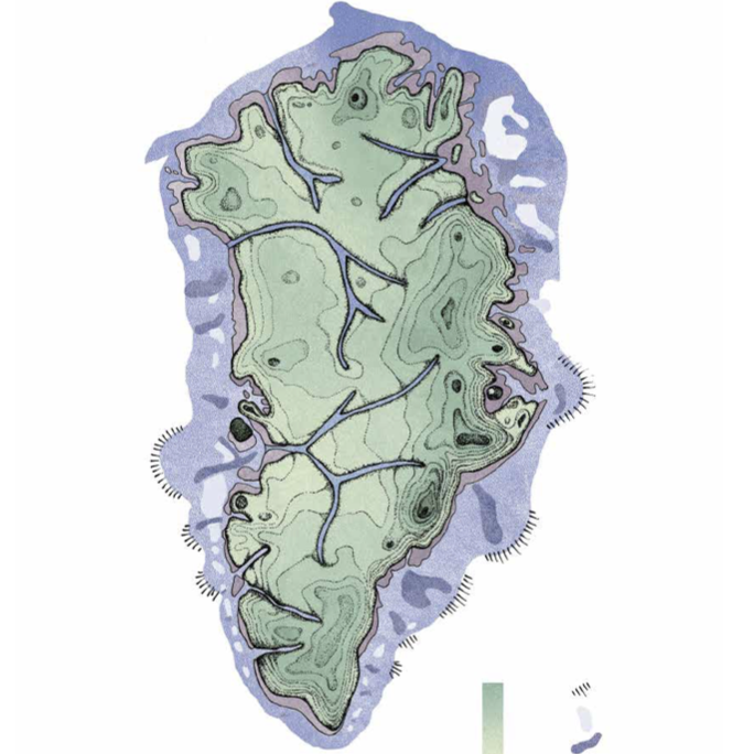 Hvis indlandsisen forsvandt, ville landet under den hæve sig mange hundrede meter på øens midte. Grønland vil så se ud, som før landet blev dækket af is.