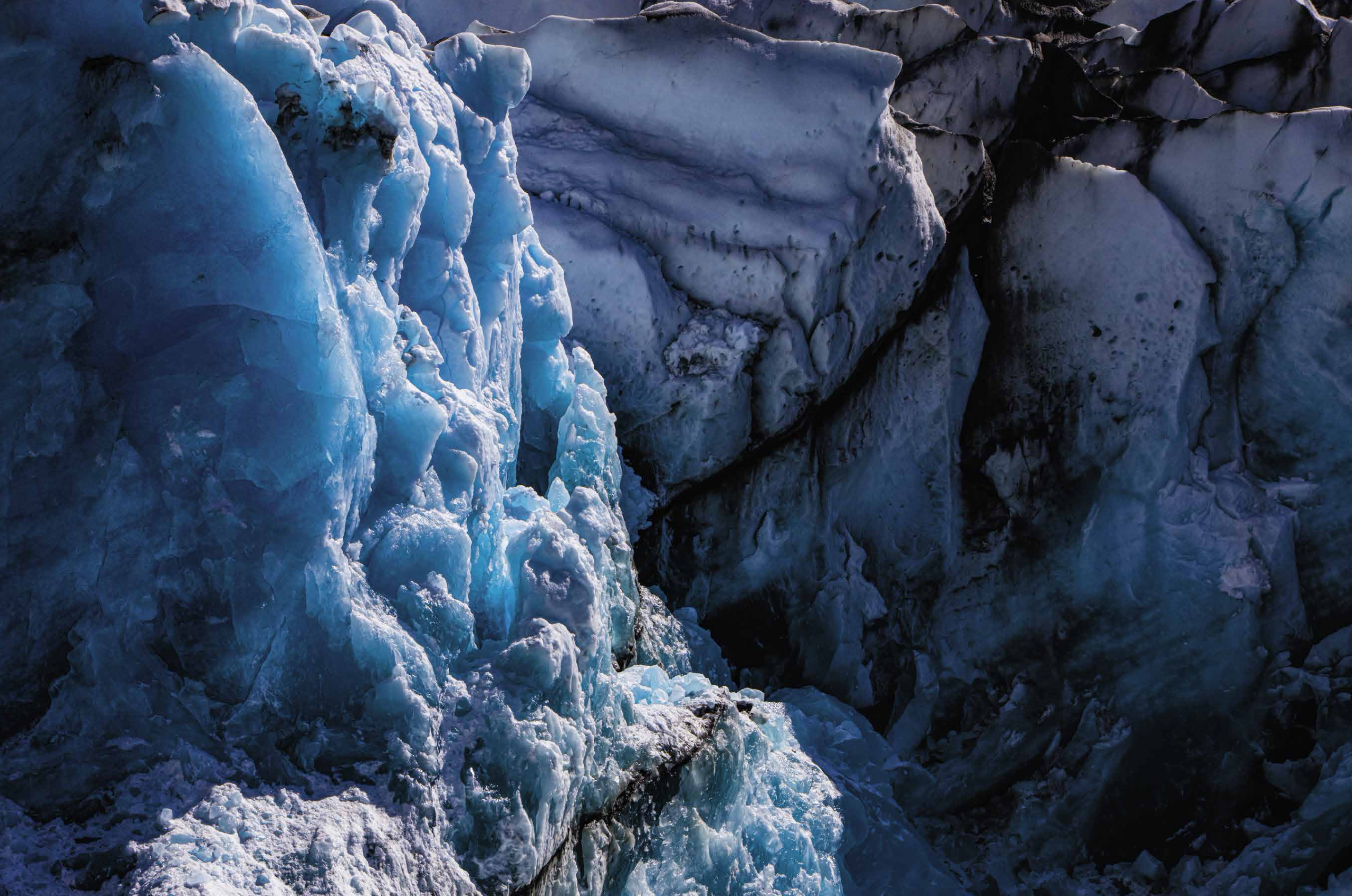 Hvid is er yngst og kommer fra den øverste del af gletsjeren. Blå is er ældre og kommer fra den nedre del af gletsjeren. Stribet is har spor af grus og jord og kommer fra bunden af gletsjeren. Sort is er dannet af smeltevand.