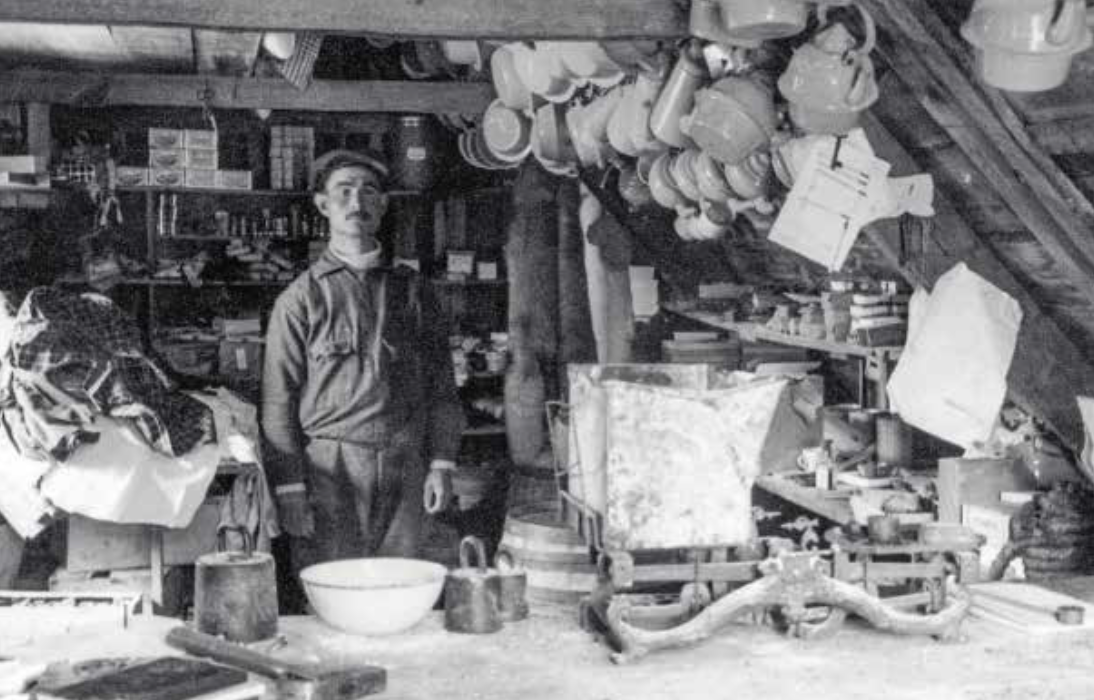 Det er udstedsbestyrer Sofus, der er i sin butik. Disse butikker befandt sig i handelsstederne og forsynede fangerne med bl.a. europæiske varer.